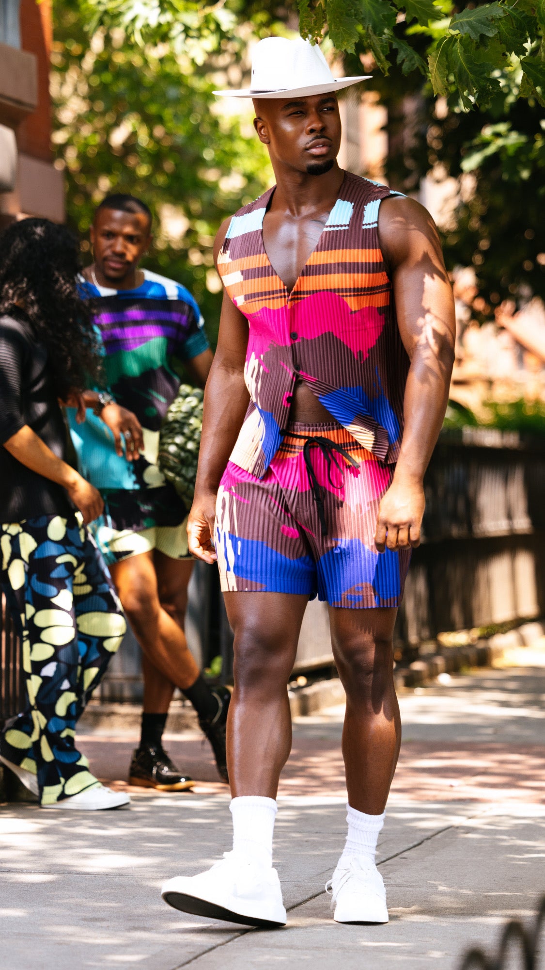 Model is 5'8 175lbs muscular wearing a small vest and 30waist shorts