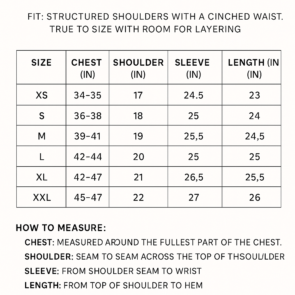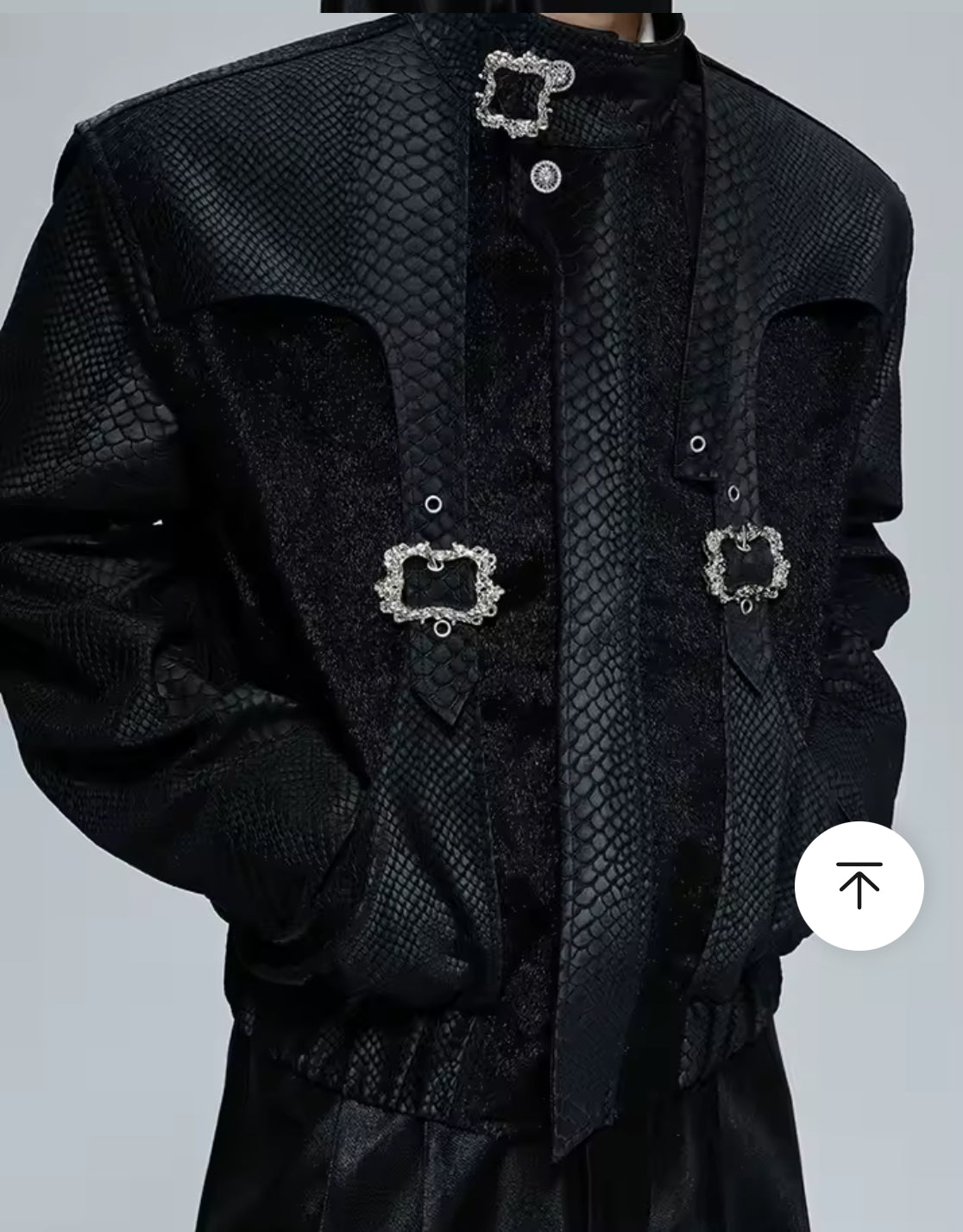 A bold, sculptural jacket crafted in premium croc-embossed vegan leather. Designed with strong architectural shoulders, a high stand collar, and dimensional front paneling, this piece delivers instant presence. Custom crystal buckles add couture-level shine, while the cinched waistband shapes the silhouette with precision. A true statement jacket for those who lead, not follow.