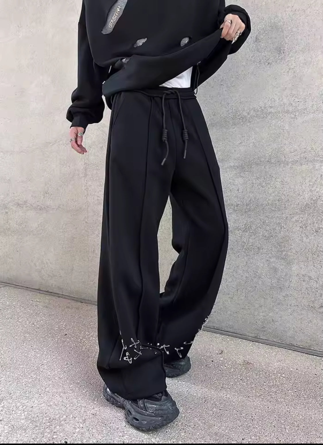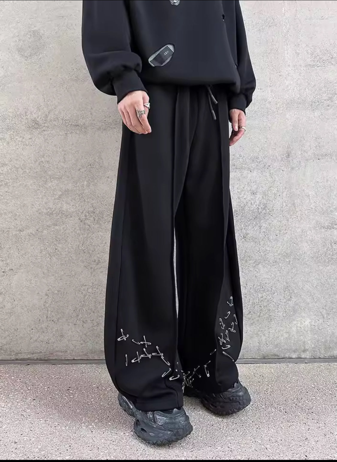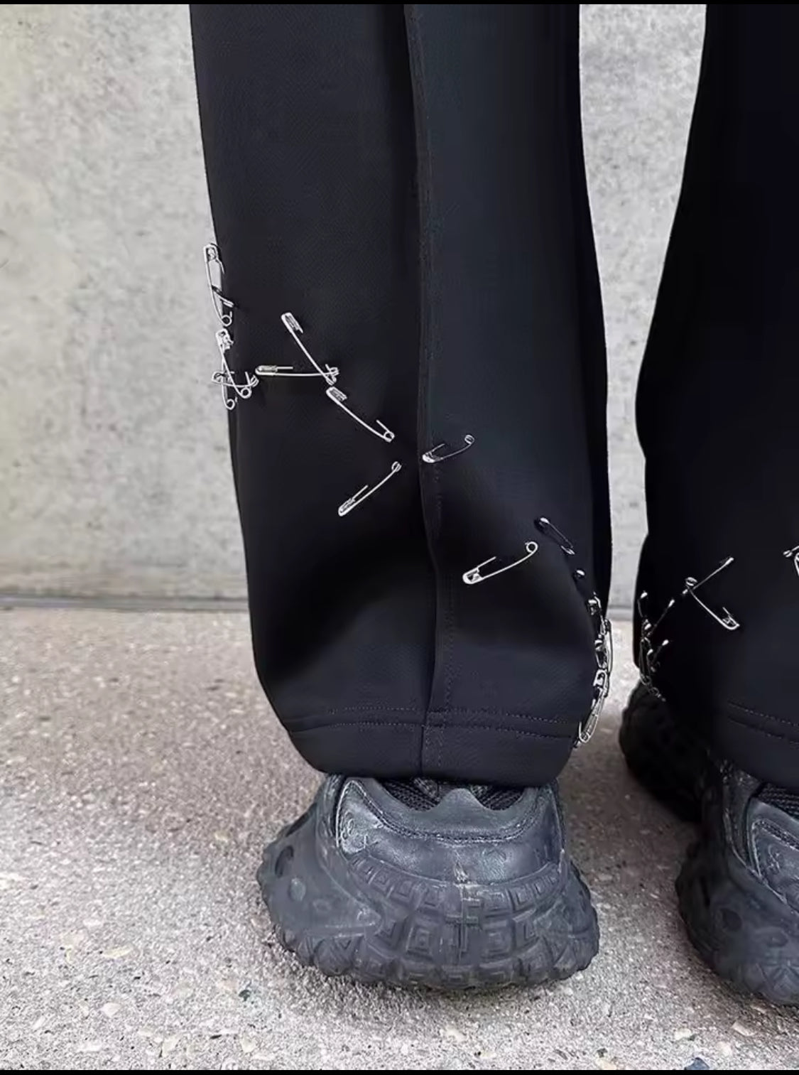 A statement silhouette with edge. Tailored wide-leg pants featuring signature safety pin detailing along the hem, front pleats, and an adjustable elastic waist. Designed for movement, attitude, and ease.