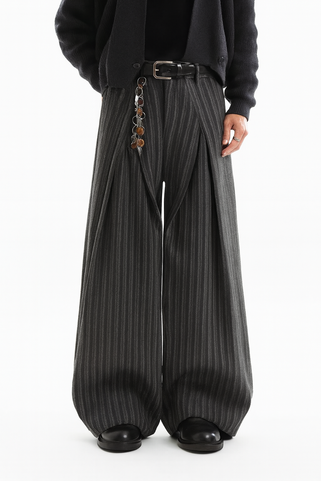 A full-length, mid-weight polyester trouser designed with a dramatic wide-leg silhouette and soft textured pattern. Features a flat front, mid-rise waist, and a regular fit through the hips that expands into bold volume. Perfect for elevated casual wear and modern street styling.