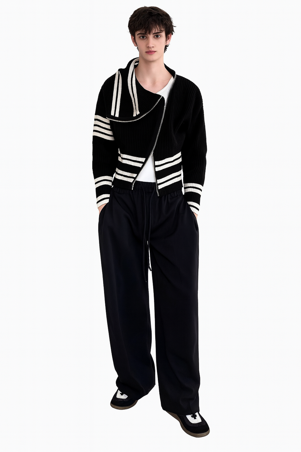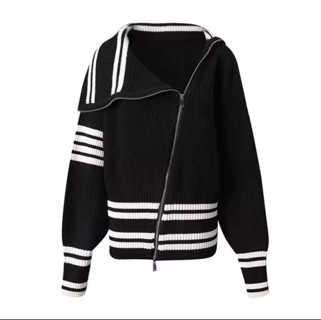 Bold ivory striping is meticulously woven into the sleeves, hem, and collar, creating a sharp, architectural contrast against the deep black base. The silhouette is relaxed yet refined, with sculpted sleeves and a cropped finish that falls effortlessly at the waist.