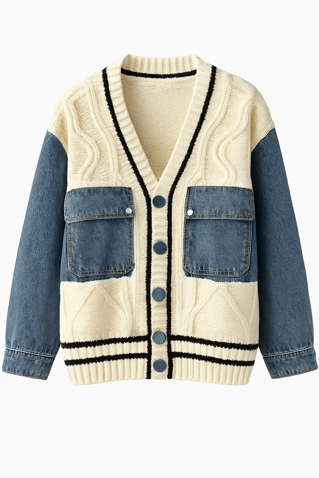 The deep V-neckline is framed with bold black contrast trimming, leading into a row of signature blue buttons that echo the denim detailing throughout. Oversized front pockets and full denim sleeves introduce a sculptural dimension, while the ribbed hem and striped bands anchor the look with a touch of athletic refinement.