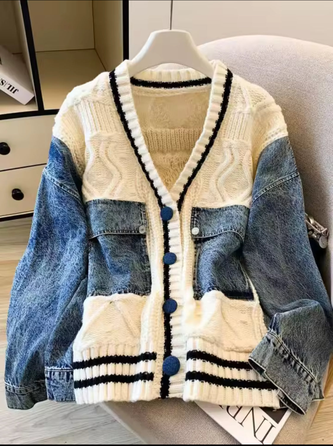 The Denim-Patch Cable Knit Cardigan is a statement of refined contrast — pairing the softness of hand-textured ivory cable knit with the structure and attitude of washed indigo denim. Cut in an intentionally relaxed silhouette, this piece blends heritage knitwear with urban utility, creating a luxurious hybrid that feels both iconic and unexpected.